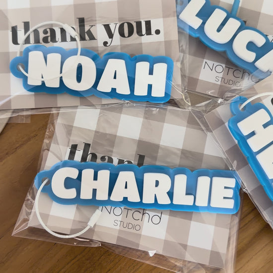 Our Bright Blue tags turn the everyday into something special — perfect for school, daycare, travel, or sports gear. Each one’s laser cut with your chosen name, crafted from layered acrylic for strength, and finished with crisp white lettering.